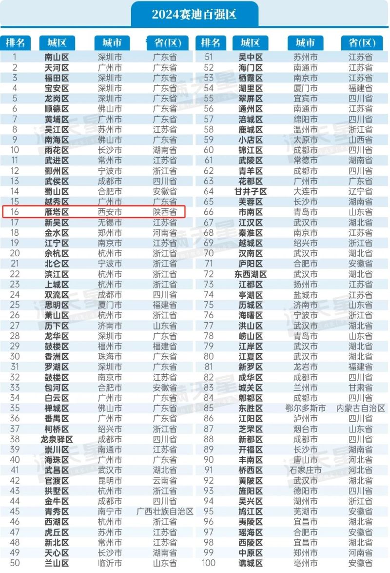 西安市雁塔区继续蝉联全国百强区TOP16,西北第一。