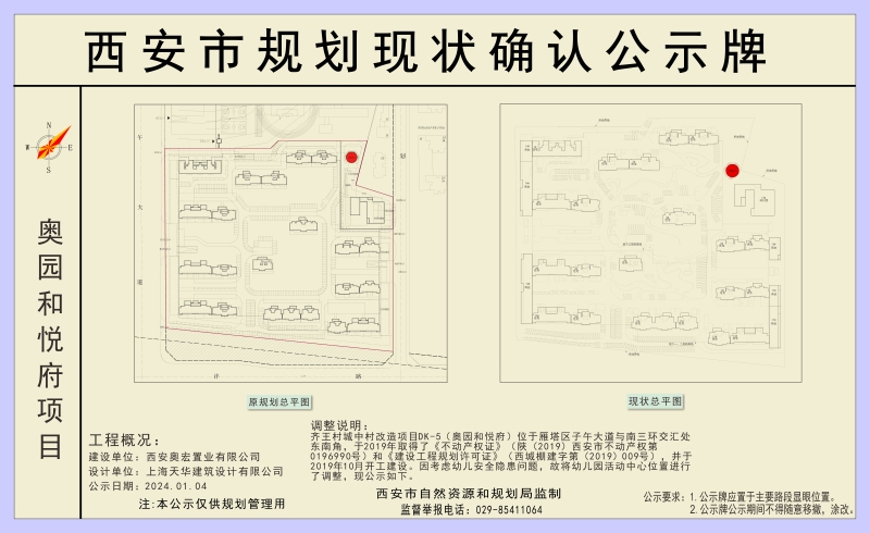 由西安奥宏置业有限公司开发建设的奥园和悦府项目,于2019年取得了建设工程规划许可证,并于2019年10月开工建设。现向我局申请规划条件核实,根据《关于加强建设工程规划条件核实管理工作的通知》文件要求,现将幼儿园活动中心现状位置予以公示。