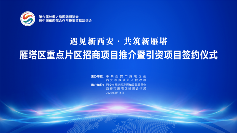 8月15日下午,在第六届丝绸之路国际博览会开幕之际,雁塔区举行“重点片区招商项目推介暨引资项目签约仪式”。会上,全面推介了雁塔区优良的投资环境和比较优势,展示了经济社会高质量发展成就,介绍了“五区三园”的产业布局和重点引资项目。19个项目在现场成功签约,涵盖片区改造、政校企合作、产业投资、民生保障等多个领域,投资总额736.45亿元。