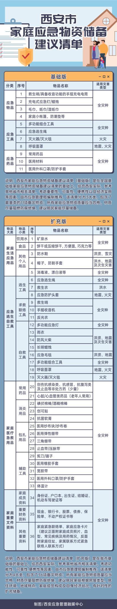 近日,西安市防灾减灾救灾委员会办公室、西安市应急管理局,借鉴部分省市做法,结合本地自然灾害等突发事件特点,编制发布了《西安市家庭应急物资储备建议清单》(含基础版和扩充版),推荐市民家庭酌情购买储备,倡导市民增强应急防灾避险意识,提升家庭自救互救逃生能力。