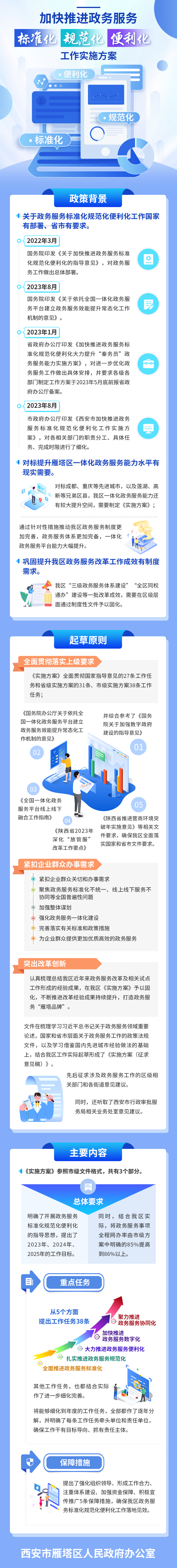 一、政策背景一是关于政务服务标准化规范化便利化工作国家有部署、省市有要求。2022年3月,国务院印发《关于加快推进政务服务标准化规范化便利化的指导意见》,对政务服务工作做出总体部署。2023年8月,市政府办公厅印发《西安市加快推进政务服务标准化规范化便利化工作实施方案》,对各相关部门的职责分工、具体任务、完成时限进行了细化。 |