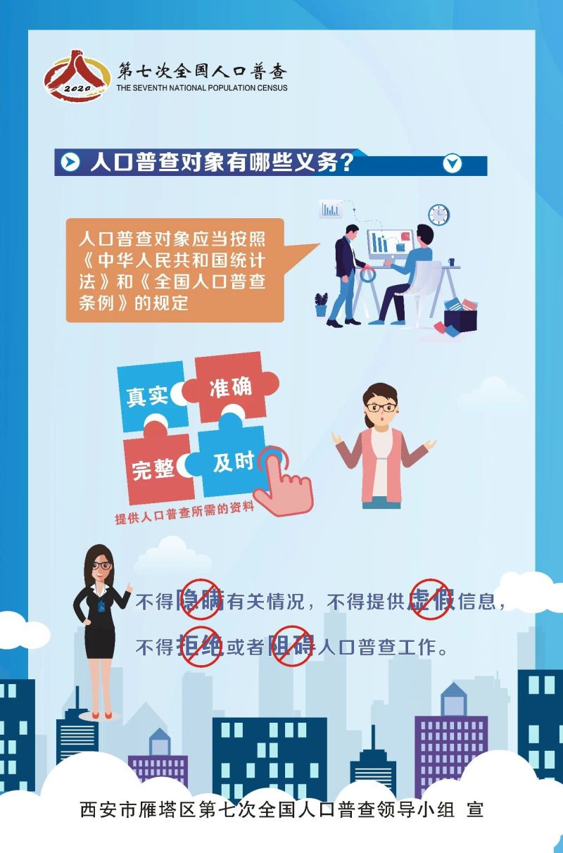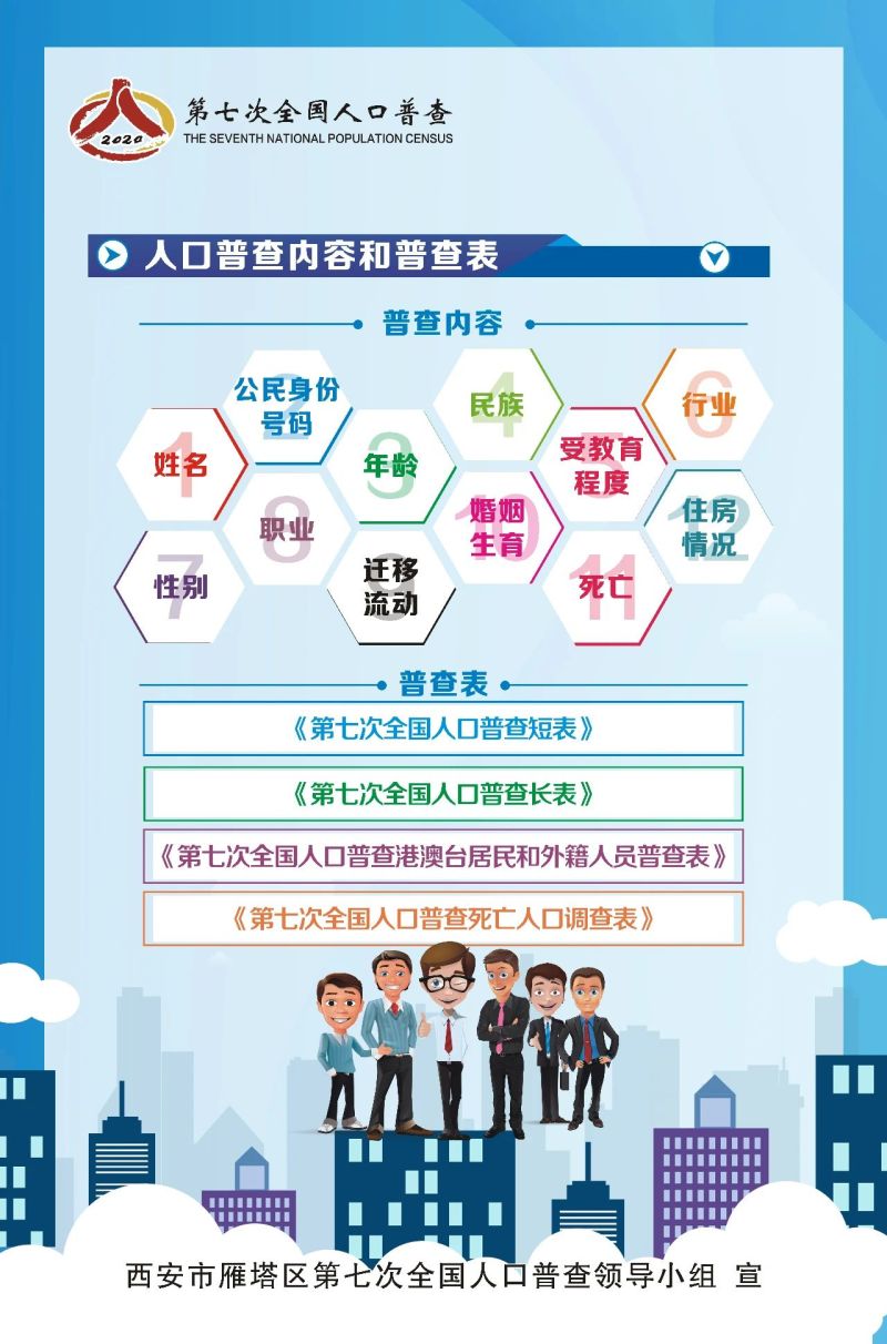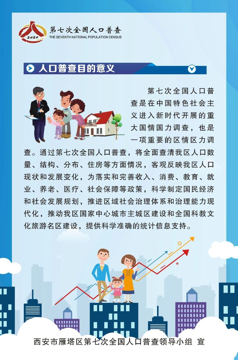 第七次全国人口普查是中国特色社会主义进入新时代,第一个百年奋斗目标即将实现,人口发展进入重要转折期的一次大型国情国力调查。通过人口普查,全面查清人口数量、结构、分布、住房等方面的最新情况,为统筹推进“新冠肺炎”疫情防控和经济社会发展,推动高质量发展提供重要数据支撑。雁塔区第七次全国人口普查开始啦!一分钟、十张图,带您走进人口普查……