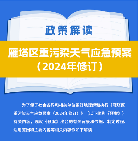 为了便于社会各界和相关单位更好地理解和执行《雁塔区重污染天气应急预案(2024年修订)》(以下简称《预案》)有关内容,现就《预案》出台的有关背景和依据、制定过程、适用范围和主要内容等相关内容作如下解读: