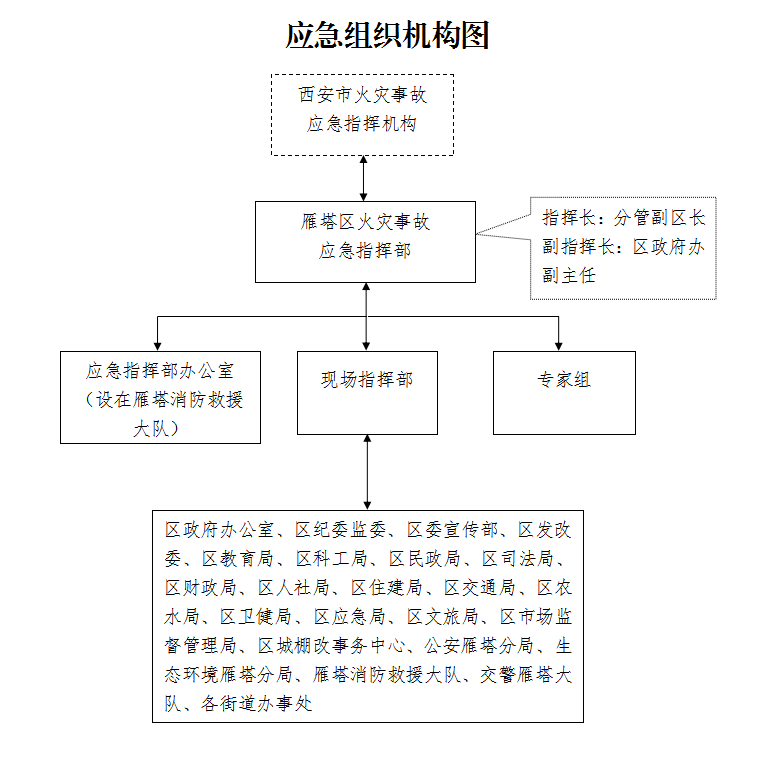 当发生一般以上火灾事故时,雁塔区成立区火灾事故应急指挥部(以下简称区应急指挥部),在区应急委的领导下,实施对辖区内火灾事故应急处置的统一指挥。其组成人员如下: