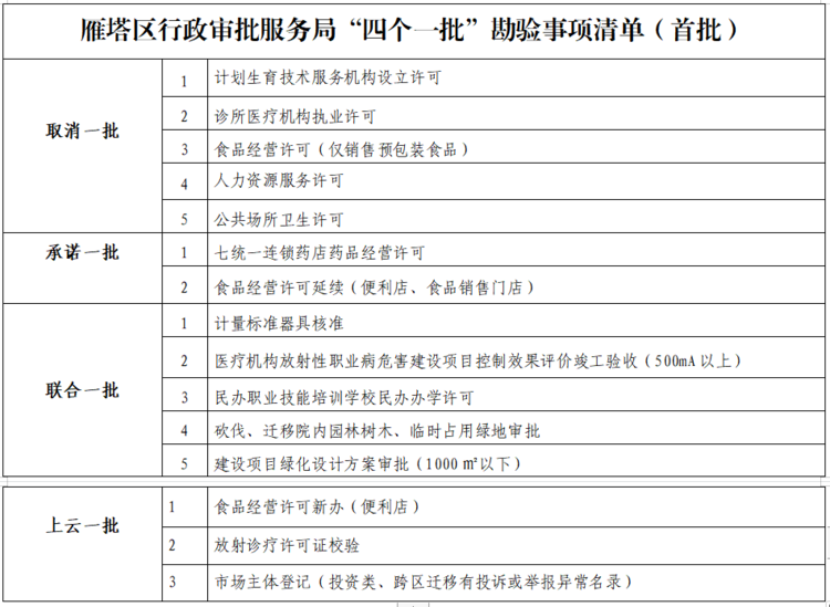 目前,雁塔区行政审批局梳理推出首批“四个一批”勘验事项清单。一是“取消一批”勘验事项5项。现有的现场勘验事项中无明确法律法规依据无重大安全责任风险的许可事项,或者新的法律法规明确“许可”改“备案”的审批事项一律取消现场勘验。二是“承诺一批”勘验事项2项。依据相关法律法规,可以实现“告知承诺”的现场勘验事项由申请人填写告知承诺书后不再进行现场勘验或事后复勘。三是“联合一批”勘验事项5项。对风险度高审批要求复杂的事项,邀请专家或者监管部门联合开展现场勘验,提供精准规范的指导,帮助企业群众高效通过审批。四是“上云一批”勘验,实现不见面审批。