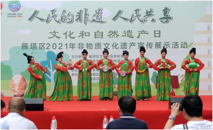 6月11日下午,曼妙的舞姿,悠扬的歌声,开场舞《唐宫夜宴》赢得了现场观众的阵阵掌声,这是雁塔区2021年非物质文化遗产宣传展示活动的精彩瞬间。活动由雁塔区文旅局、西安市隋唐长安城遗址保护中心、电子城街道党工委主办,区文化馆、图书馆、非遗保护中心承办,立丰城LECITY协办。雁塔区相关负责人、非遗传承人、市民代表等100余人参加。