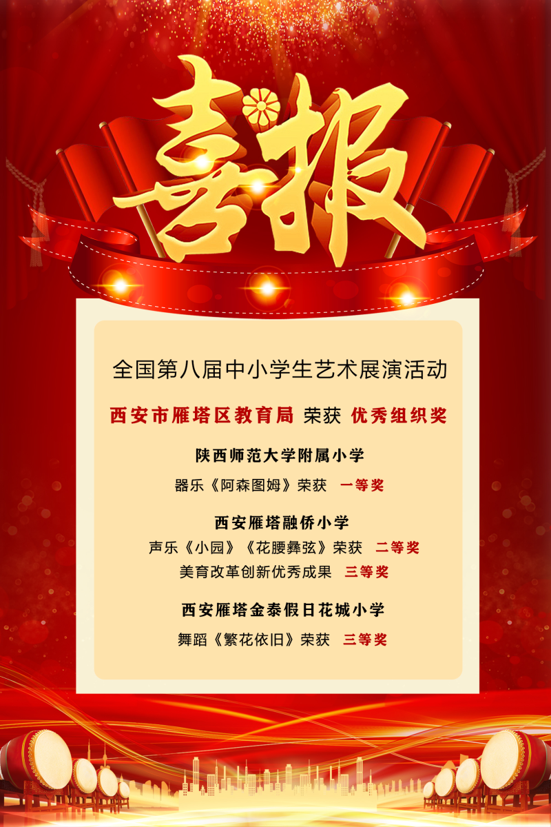 为深入学习贯彻党的二十大精神,全面实施学校美育浸润行动,根据《教育部关于举办全国第八届中小学生艺术展演活动的通知》《陕西省教育厅办公室关于举办陕西省第八届中小学生艺术展演活动的通知》《西安市教育局办公室关于举办2024年中小学生艺术展演活动的通知》要求,雁塔区教育局高度重视,精心组织,认真筹备,开展了内容丰富、形式多样、参与面广泛的雁塔区校园文化艺术节暨中小学生艺术展演活动,形成了浓厚的艺术氛围。经过校级、区级、市级、省级层层选拔和推荐,最终,我区在全国第八届中小学生艺术比赛中取得了可喜成绩。