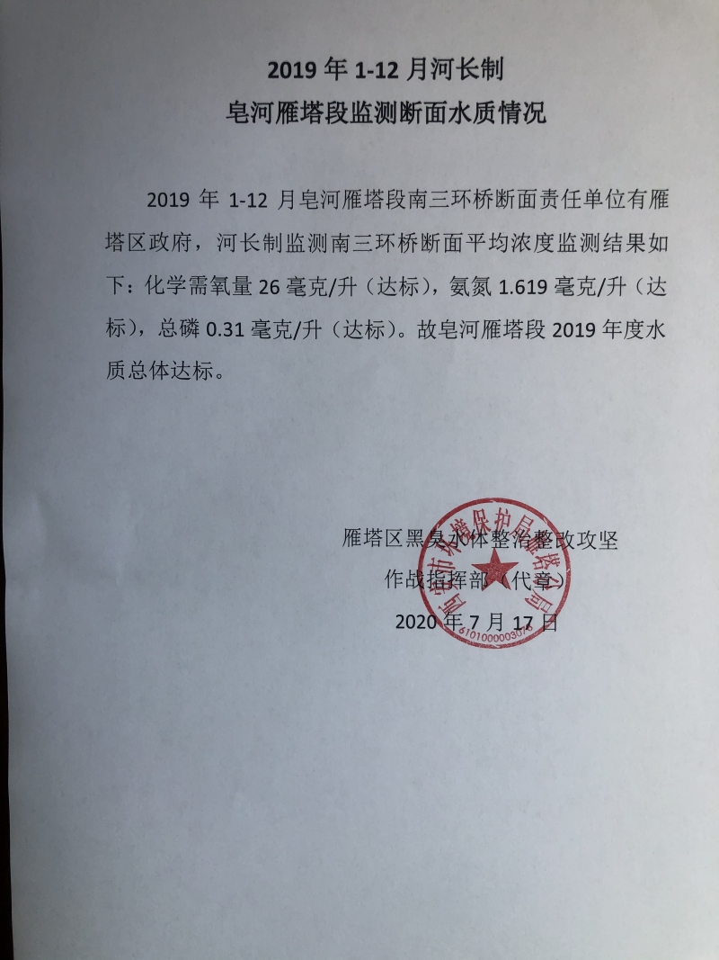 2019年1-12月皂河雁塔段南三环桥断面责任单位有雁塔区政府,河长制监测南三环桥断面平均浓度监测结果如下:化学需氧量26毫克/升(达标),氨氮1.619毫克/升(达标),总磷0.31毫克/升(达标)。故皂河雁塔段2019年度水质总体达标。