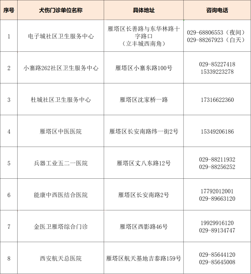 2023年“双节”期间,为方便辖区群众能够及时处置犬类等动物咬伤、抓伤情况,雁塔区8家犬伤门诊将提供24小时犬伤暴露处置服务。