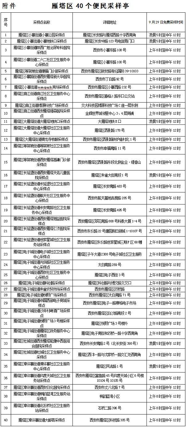 (二)届时,雁塔区40个便民采样亭(见附件)也将免费向广大市民服务,来雁塔旅游的游客可就近选择完成核酸采样。