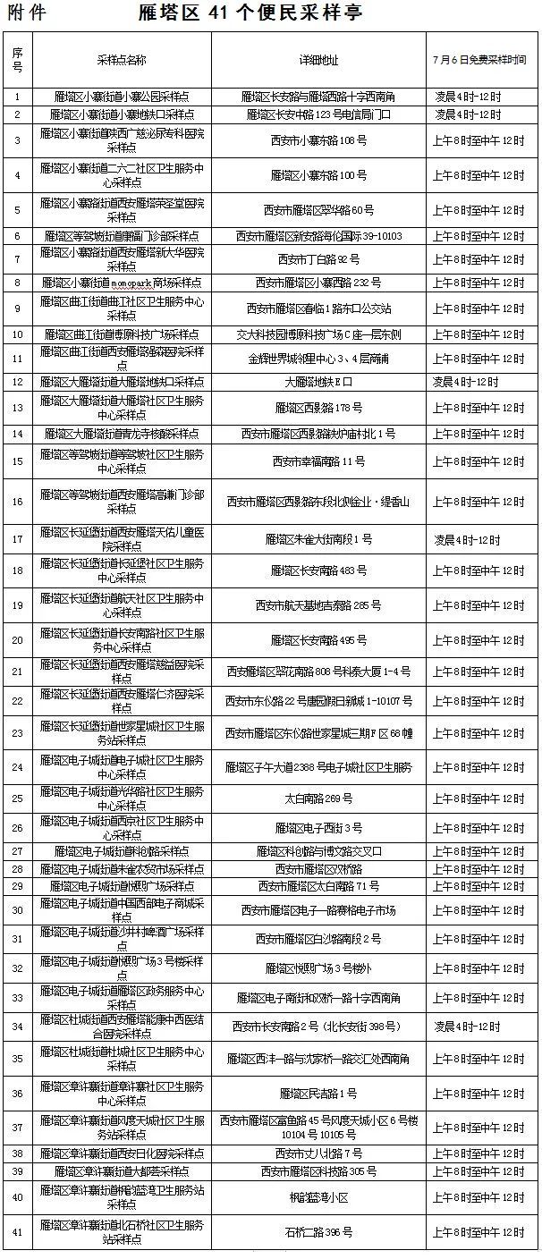 (二)届时,雁塔区41个便民采样亭(见附件)也将免费向广大市民服务,来雁塔旅游的游客可就近选择完成核酸采样。
