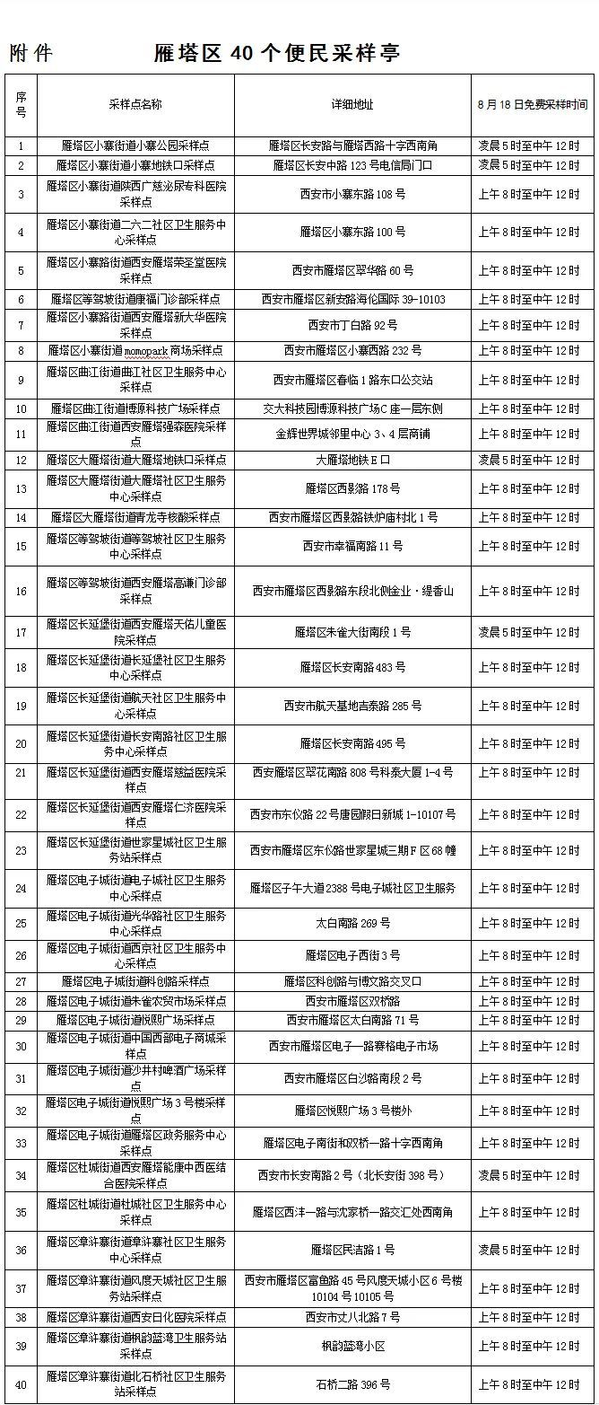(二)届时,雁塔区40个便民采样亭(见附件)也将免费向广大市民服务,来雁塔旅游的游客可就近选择完成核酸采样。