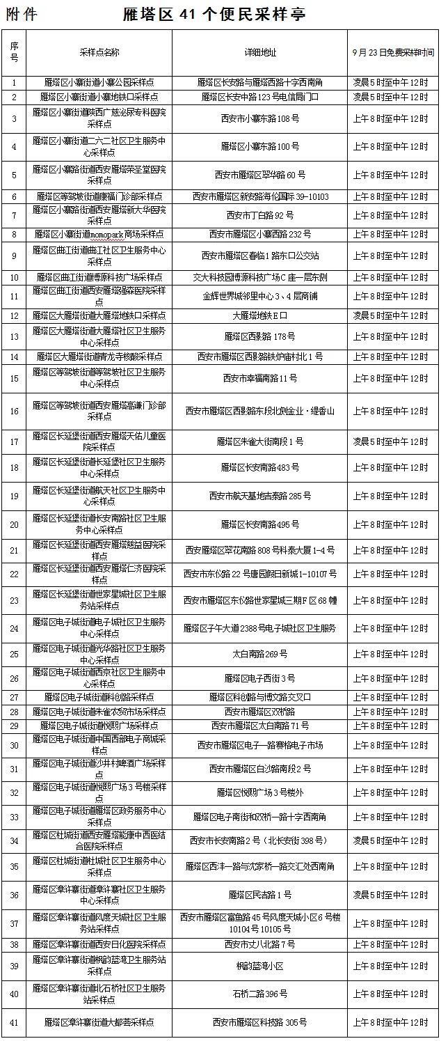 (二)届时,雁塔区41个便民采样亭(见附件)也将免费向广大市民服务,来雁塔旅游的游客可就近选择完成核酸采样。