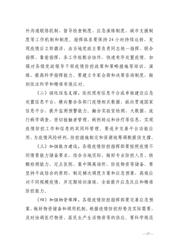地方各级党委政府要健全疫情防控指挥体系,明确部门职责和分工。建立指挥系统启动机制、信息报告制度、督导检查制度、应急演练制度、城市支援制度等工作机制和制度。提高信息共享和整合,为疫情风险研判、防控措施制定和资源统筹调配提供支撑。根据不同疫情情景,做好专业防控人员、核酸检测能力、定点医院、集中隔离场所、防疫物资等储备。