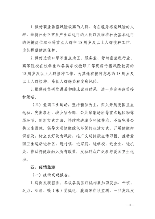 做好职业暴露风险较高、有在境外感染风险的人群、维持社会正常生产生活运行人员以及维持社会基本运行的关键岗位职业等重点人群接种工作;做好边境口岸等重点地区、服务业等疾病传播风险较高人群接种工作,降低人群感染和发病风险。根据疫苗研发进展和临床试验结果,进一步完善疫苗接种策略。