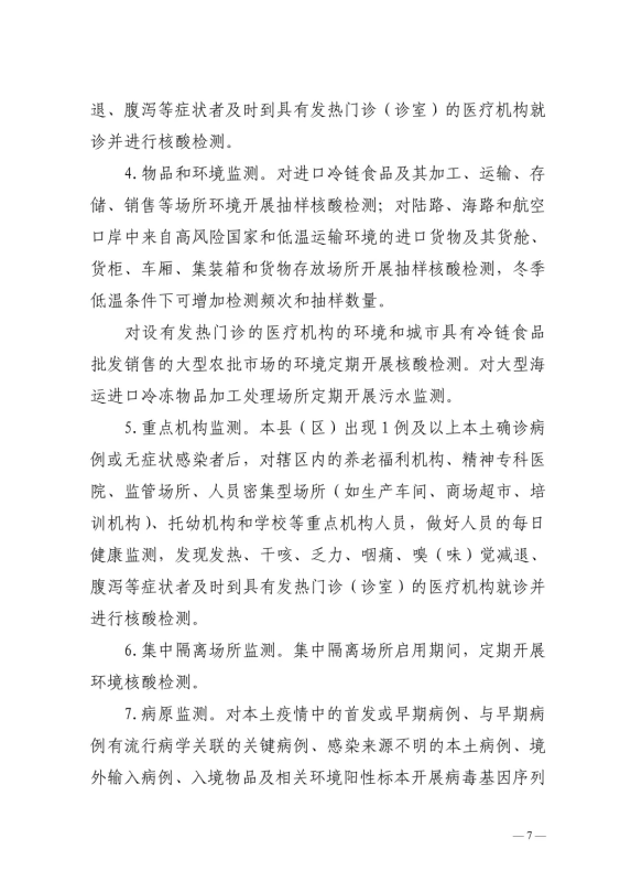 坚持人、物和环境监测,强化医疗机构就诊人员、风险职业人群、重点人群、重点机构等疫情监测,及时发现和报告疫情。强化病原监测,动态监测病毒变异情况,了解病毒变异对病原检测和疫苗保护效果影响。