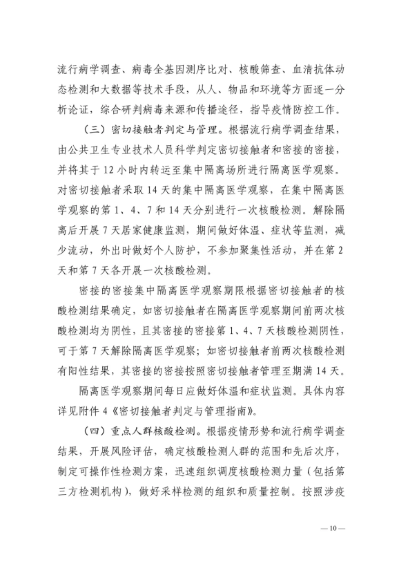 强化入境人员、密接接触者等隔离医学观察管理,要求隔离医学观察期间应采集鼻咽拭子进行核酸检测,解除隔离时应同时采集2份鼻咽拭子样本,分别使用不同核酸检测试剂检测,两次检测原则上由不同检测机构开展。解除隔离后的第2天和第7天各开展一次核酸检测,期间做好健康监测,减少流动,外出时做好个人防护,不参加聚集性活动。