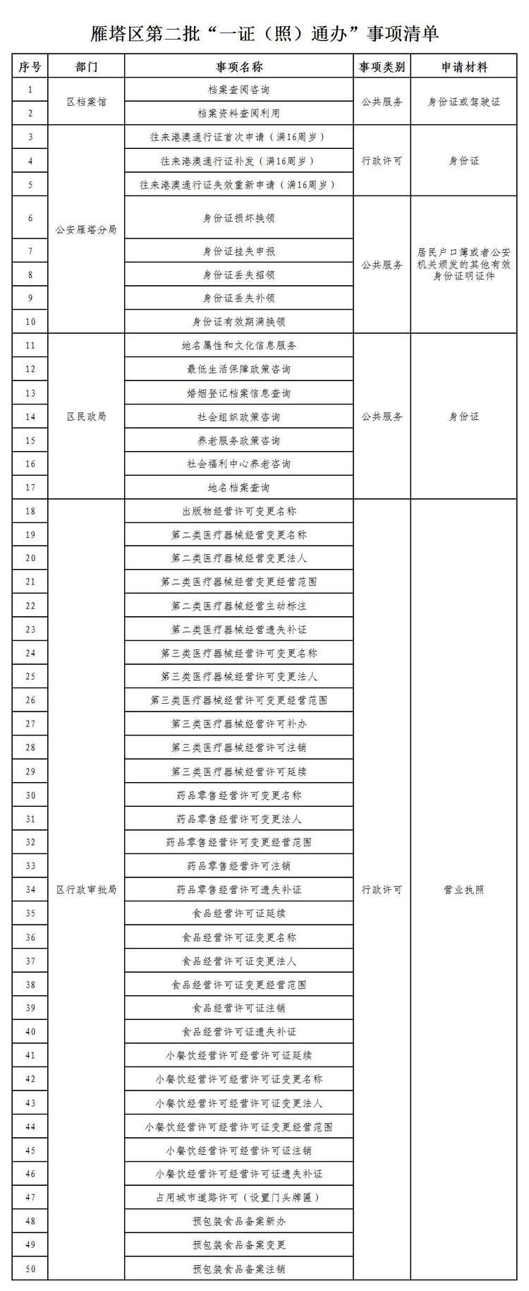 为持续深化“放管服”改革,不断优化提升营商环境,经过新一轮的梳理,8月19日,雁塔区公布第二批“一证(照)”通办事项50项。事项清单共涵盖区行政审批局、公安雁塔分局、区民政局、区档案馆等4个部门,并通过雁塔区政府门户网站向社会统一发布,接受群众和企业的监督。目前,经过两批次的事项梳理,雁塔区已累计公布“一证(照)”通办事项达到106项,并自7月份“一证(照)”通办推行以来,累计受理“一证(照)”通办业务8162件。