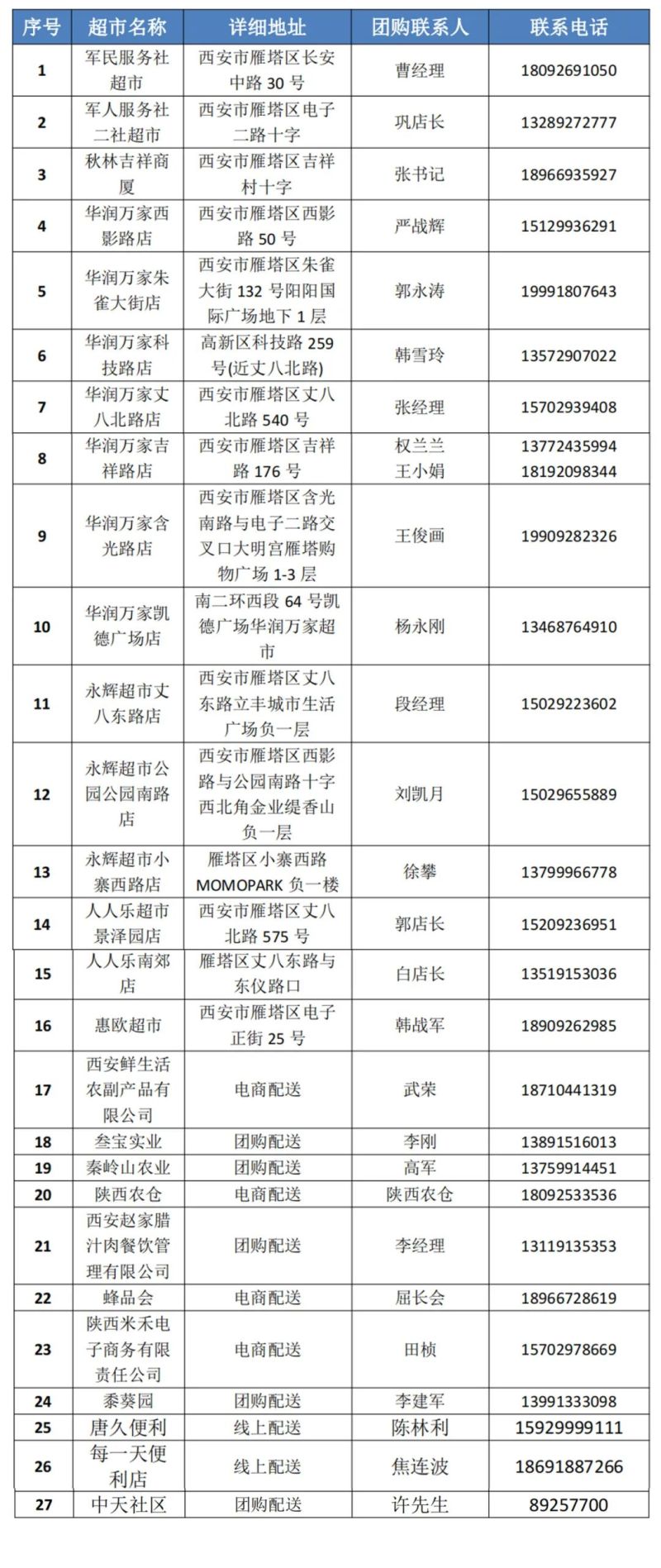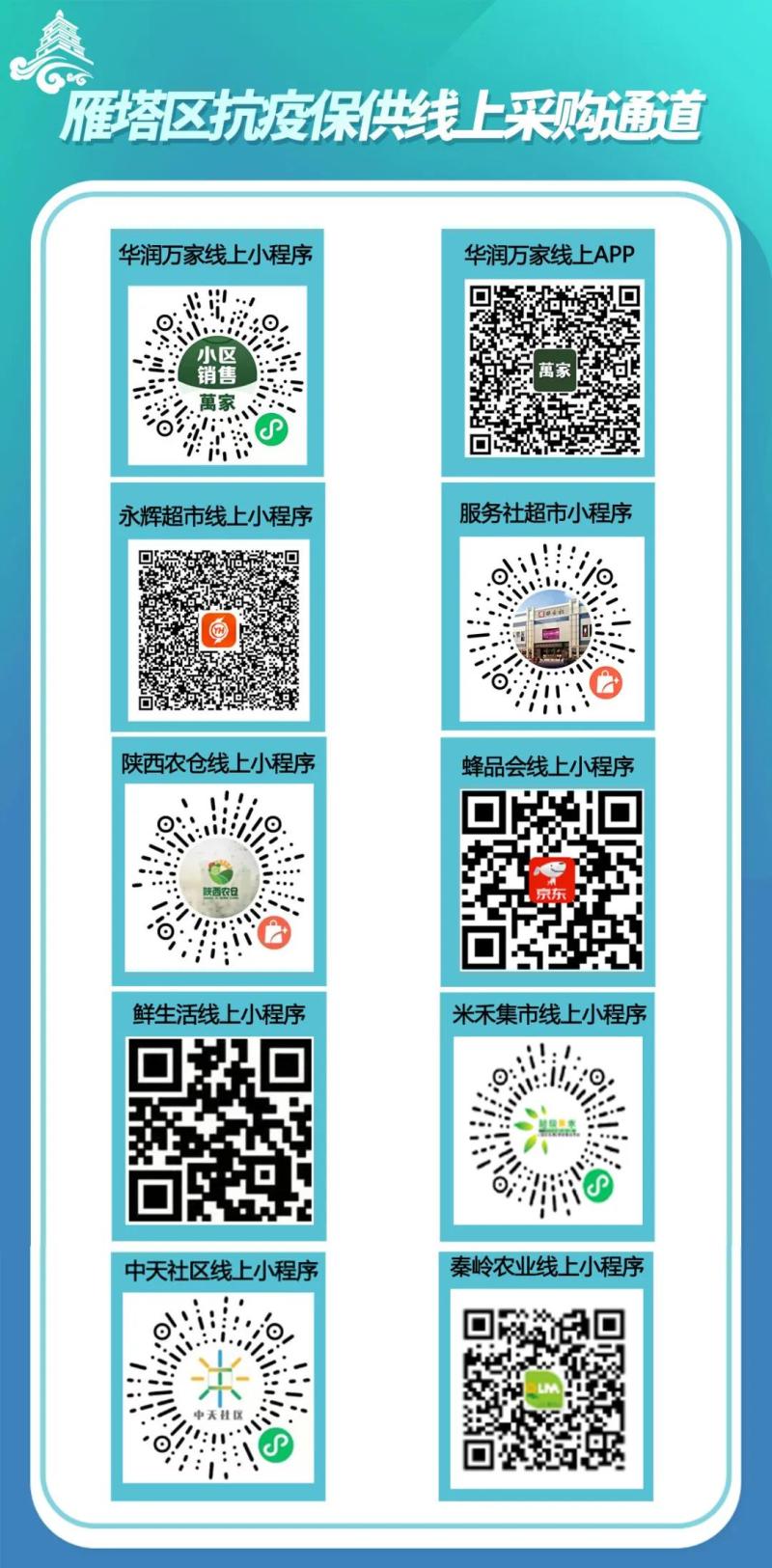 为确保物资充足,雁塔区迅速确定应急保供骨干企业名单,积极组织协调货源供给,督促华润万家、人人乐、永辉超市等商贸龙头企业加大生活必需品采购,为辖区各超市、便利店及电商平台企业办理人员通行证和车辆通行证,组织27家保供企业紧急开通线上配送业务,鼓励企业利用微信小程序、企业APP等多元化方式提供线上购买渠道,加快推广“居民下单、商超配货、集中配送、社区工作人员(志愿者)送达”的闭环供应模式,有效保障小区疫情防控期间居民的基本生活物资需求,打通服务群众“最后一百米”。