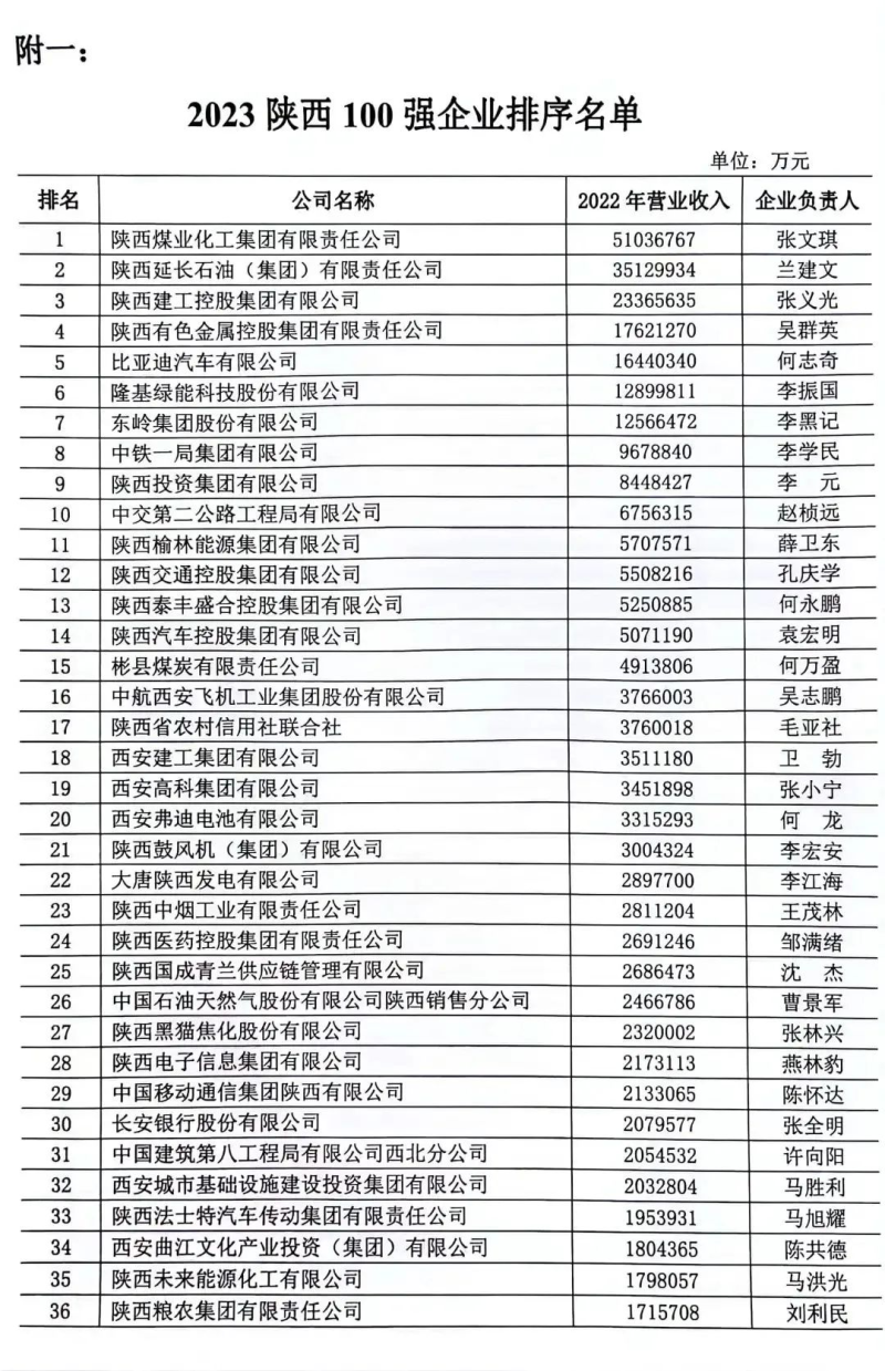 “2023陕西百强企业”和“2023陕西民营50强企业”是按照国际通行的方式,参照中国500强企业排序办法,坚持公平公正、不向企业收取费用等原则,依据企业2022年度营业收入,在企业自愿申报的基础上进行排序,并经“陕西省百强企业审定委员会”审定后产生的。现将排序名单予以公布(名单详见附件)。