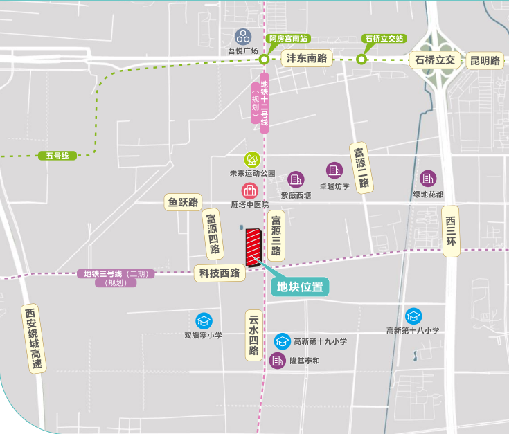宗地配套及区域优势:地处雁塔区未来产业城、西咸新区沣东新城、高新区软件新城“三城”的交汇处,是雁塔区未来产业城商业的核心地块。周边涵盖西安市高能产业资源,经济发展活力巨大。项目周边人口密度较高,卓越坊、紫薇西塘、隆基泰和、绿地花都等优质楼盘汇聚,且方圆4公里内缺乏大型商业中心(仅有吾悦广场一个综合体,距离项目2公里);项目交通优势明显,科技西路,西安绕城高速,西三环,昆明路等城市快速干道为项目提供高效的通达性。同时,地铁3号线延伸段(规划)从项目经过,地铁5号线(已开通)在项目北侧;周边建成3所幼儿园,1所小学,区域内人口密集,基础设施要素齐全,区位优势明显。