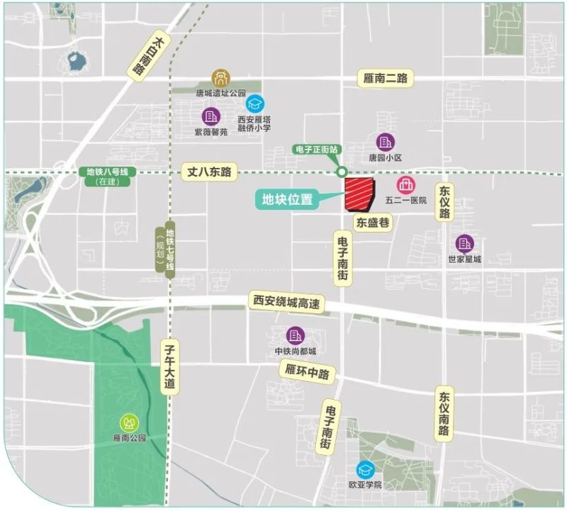 宗地四至:北临丈八东路,东临五二一医院,西临电子南街,南临东盛巷。