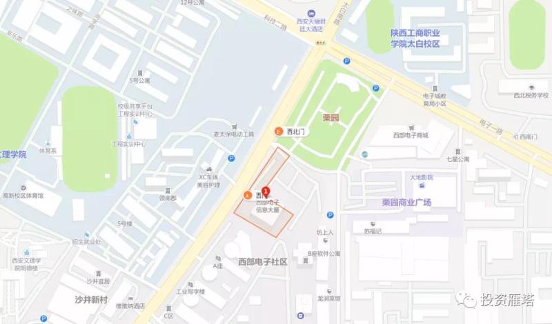项目区位:项目位于太白南路与电子一路十字东南角,西部电子广场内,南通西安大学城,北连科技路,西与高新开发区接壤,东与39所、618所等大型科研院所相邻。周边配套设施齐全,距地铁三号线太白南路站步行约8分钟,距绕城高速西高新入口仅5分钟车程,交通十分便利,办公环境氛围优越。