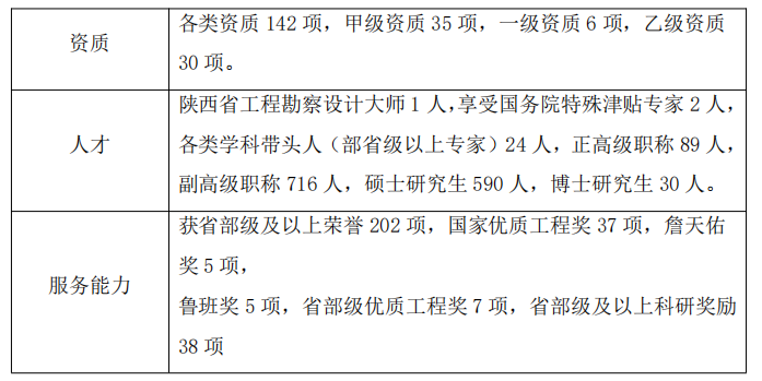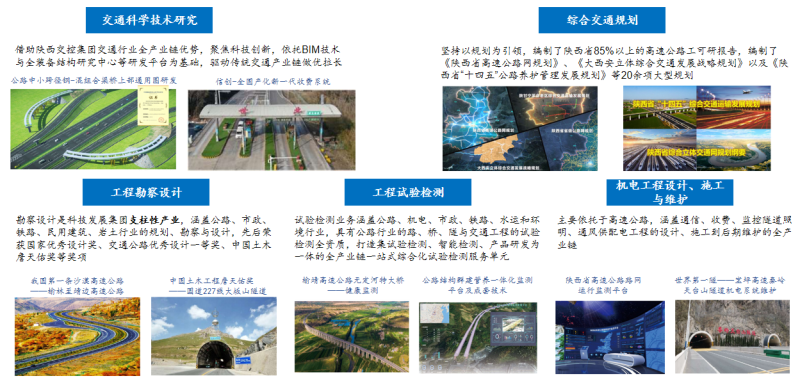公司勘察设计、试验检测、监理咨询等业务资质齐全,人才储备丰富,形成了以交通规划、勘察设计、试验检测、技术咨询、科技研发与成果转化、新基建、数字交通、智慧交通为一体的现代化综合交通科技企业集团。