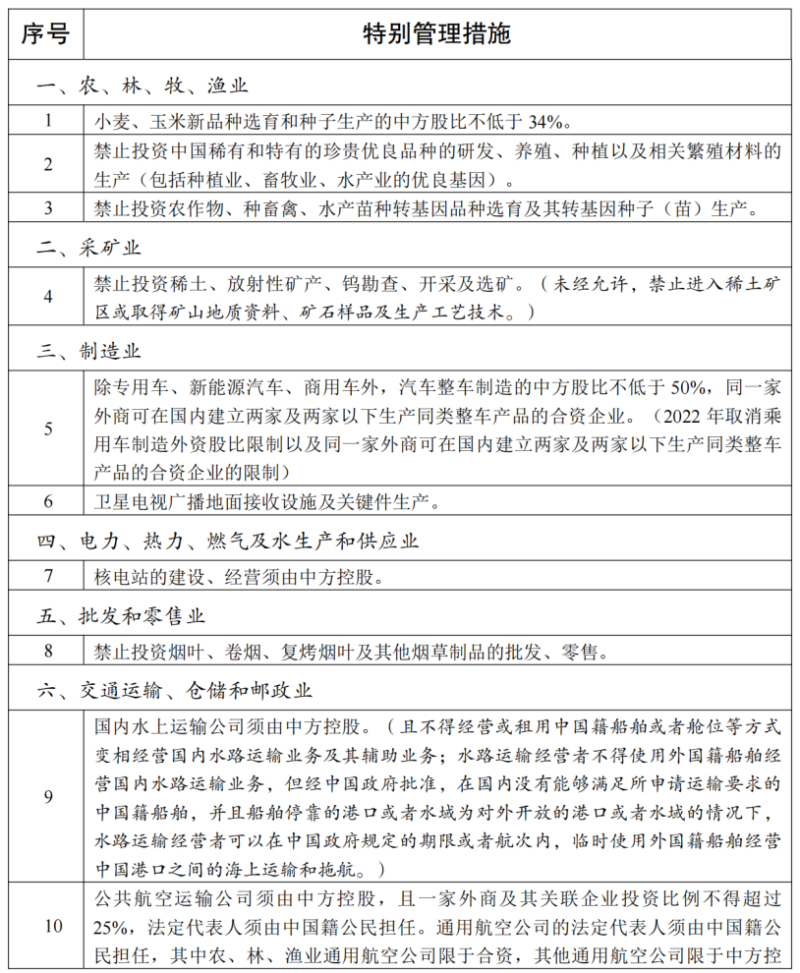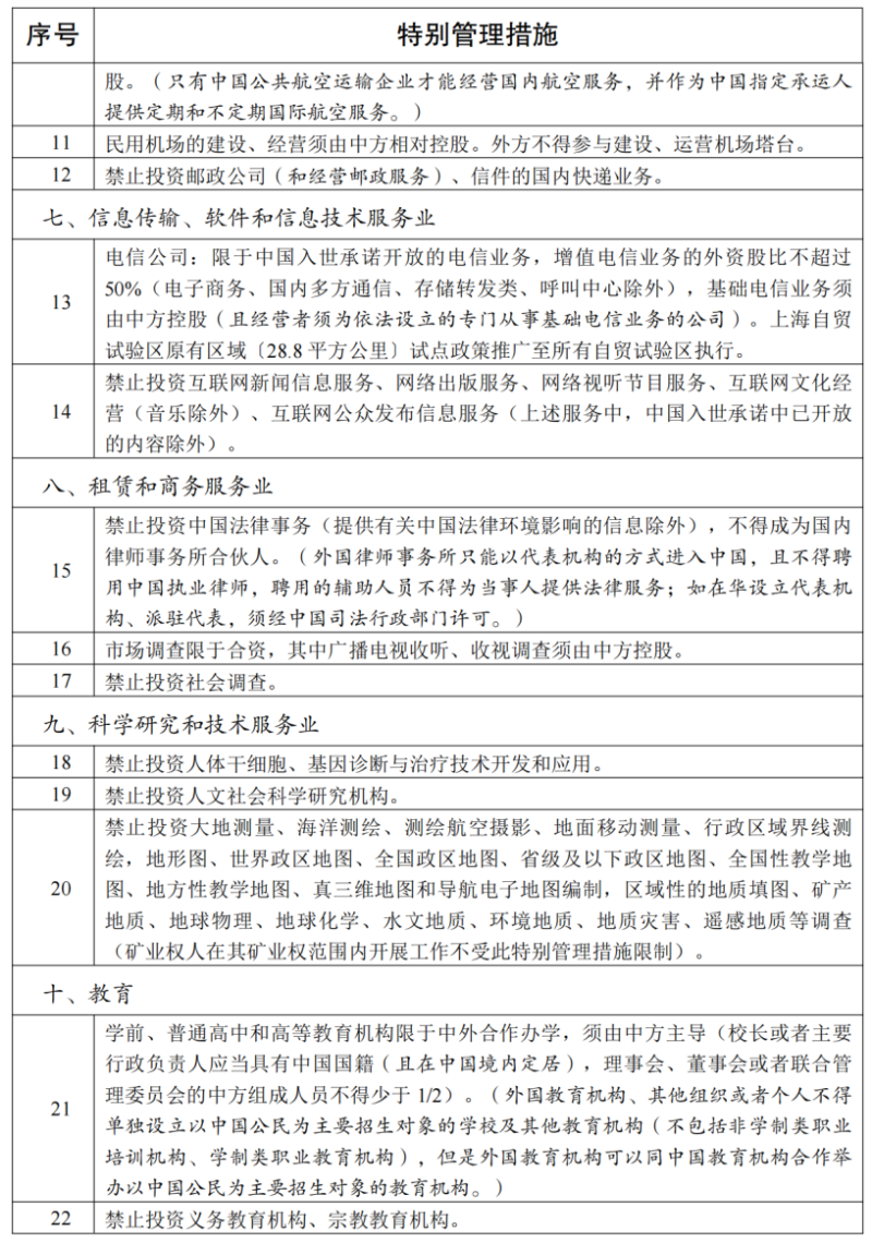 一、《自由贸易试验区外商投资准入特别管理措施(负面清单)》(以下简称《自贸试验区负面清单》)统一列出股权要求、高管要求等外商投资准入方面的特别管理措施,适用于自由贸易试验区。《自贸试验区负面清单》之外的领域,按照内外资一致原则实施管理。