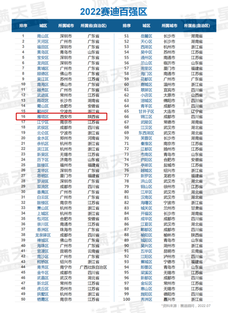 2022年7月27日,赛迪顾问城市经济研究中心重磅发布《2022年中国城区经济高质量发展研究报告暨2022赛迪百强区》,西安市雁塔区位列全国百强区榜单第16位,继续领跑西部城区。