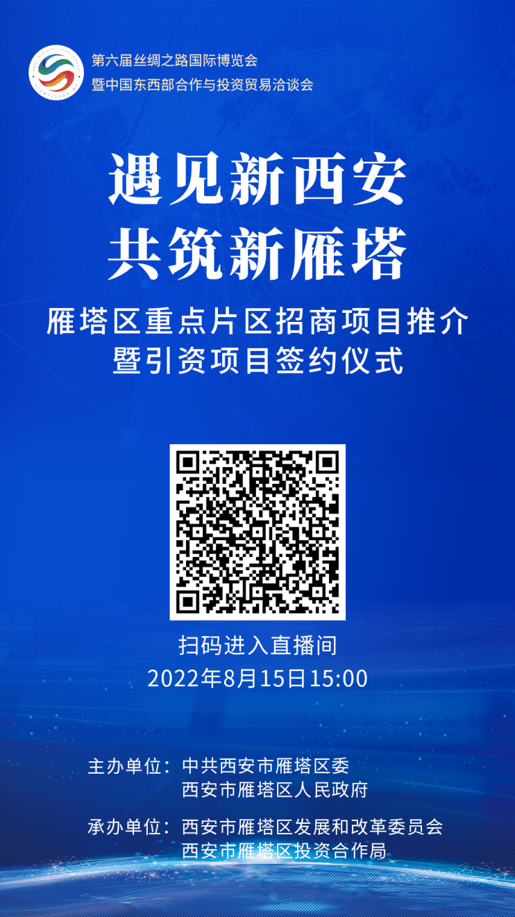 大会期间,雁塔区将于8月15日举行 “遇见新西安·共筑新雁塔——雁塔区重点片区招商项目推介暨引资项目签约仪式”。届时,西安市及雁塔区各级领导将与国内外知名企业代表共谋合作,共话发展。此次会议将通过线上线下相结合的形式呈现。